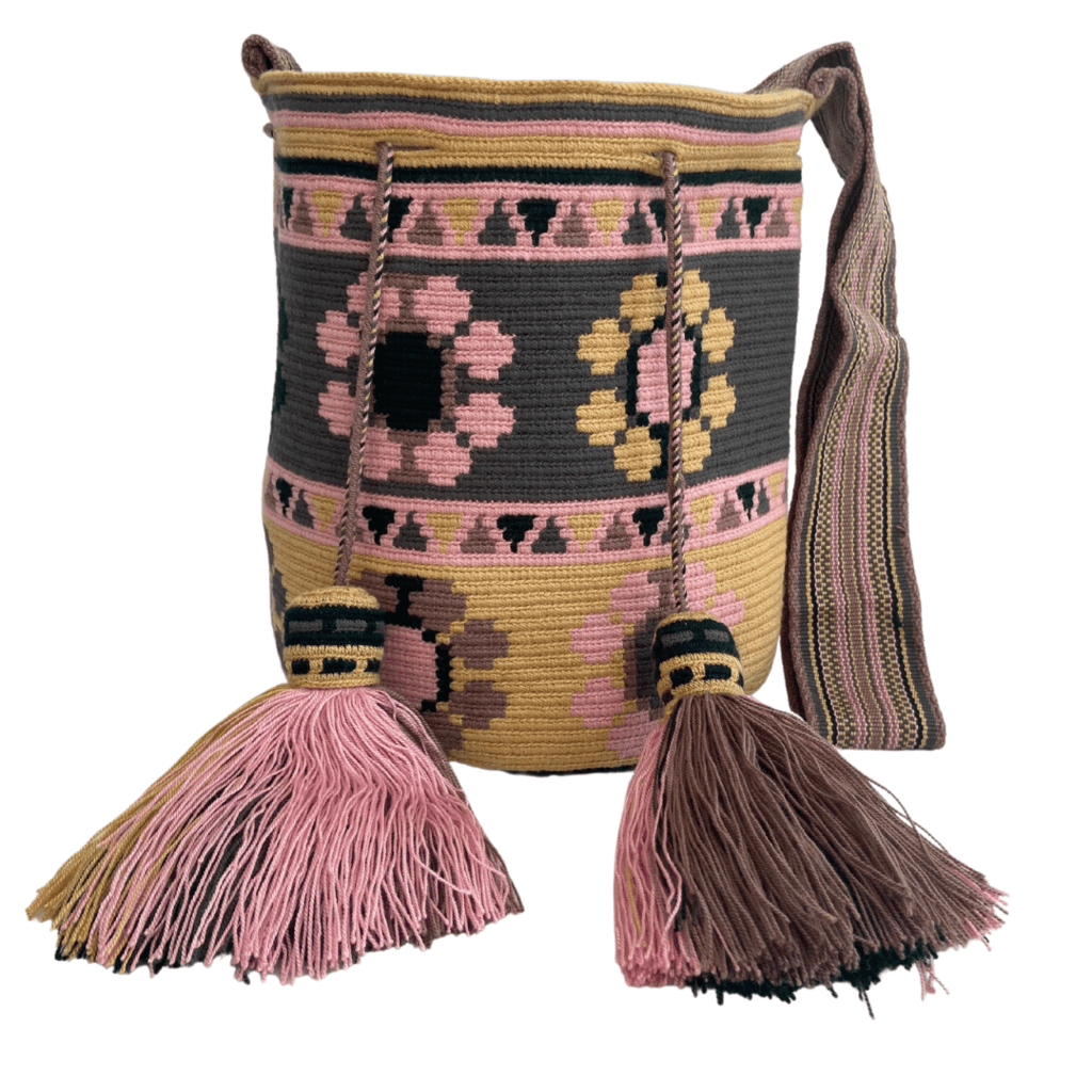 Mochila wayuú tradicional grande diseño étnico colores gris, amarillo y rosado, gasa paleteada, decorada con campaneros de gorrito frondosos de la misma tonalidad.