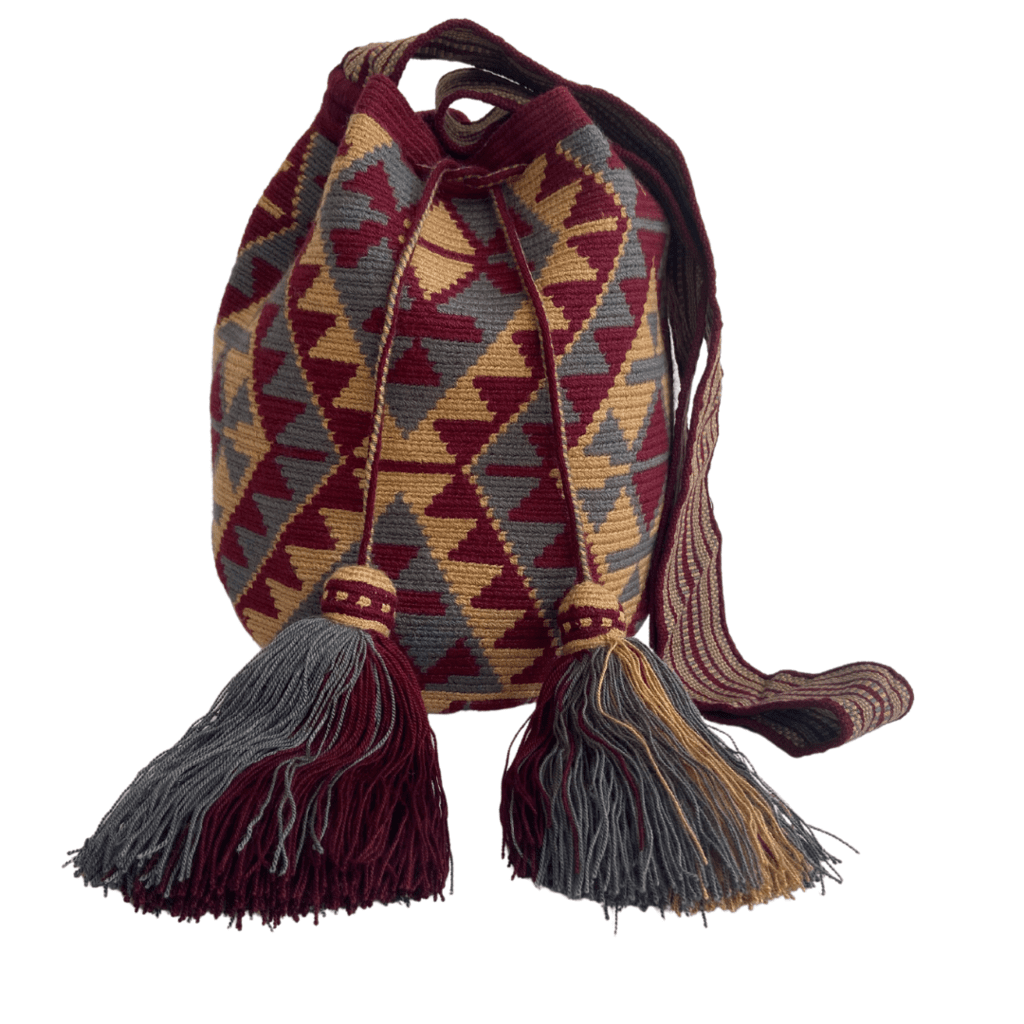 Mochila wayuú tradicional grande diseño étnico color beige, gris y Vinotinto, gasa paleteada, decorada con campaneros de gorrito frondosos de la misma tonalidad.