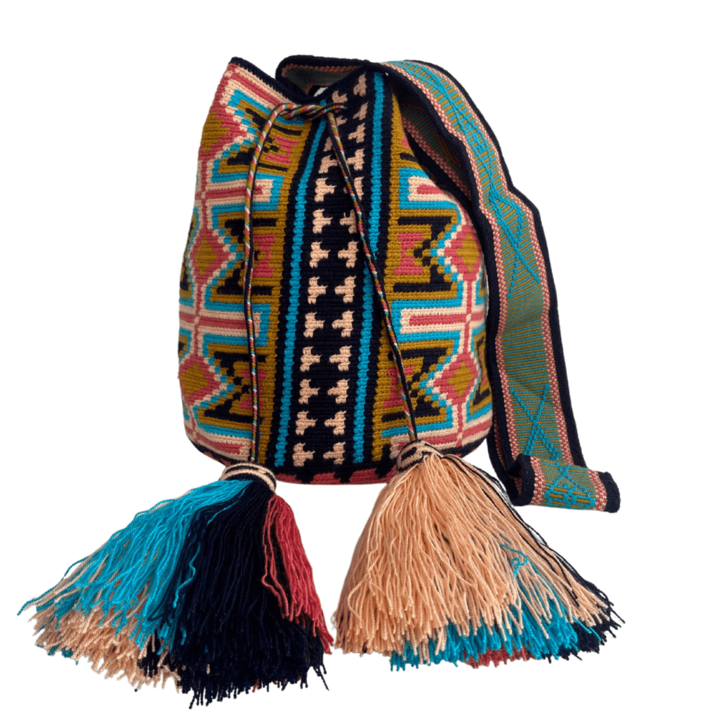 Mochila wayuú tradicional grande diseño étnico multicolor, gasa paleteada, decorada con campaneros de gorrito frondosos de la misma tonalidad.