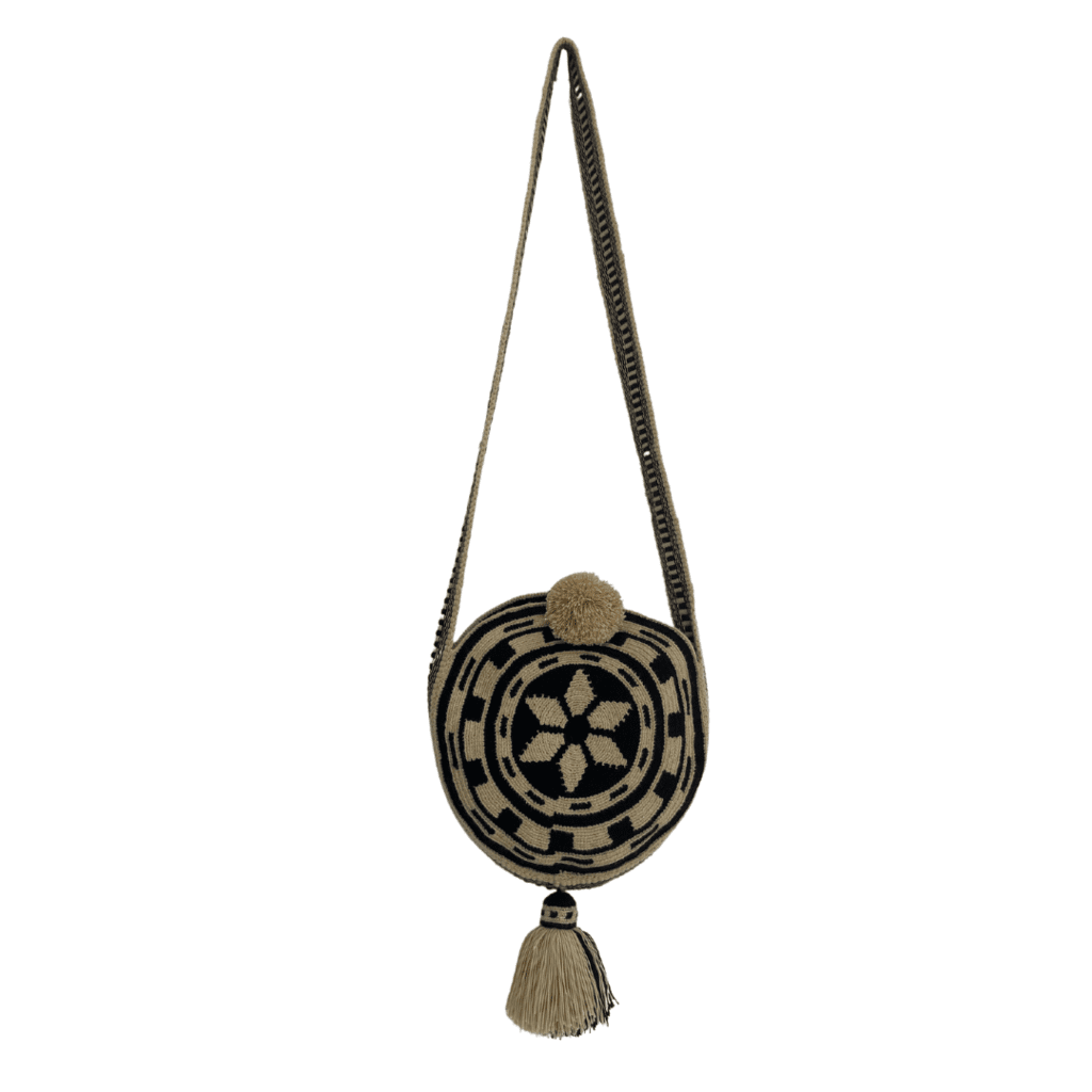 Mochila wayuú tradicional grande redondo diseño étnico color negro – beige, gasa paleteada, decorada con borlas y campaneros de gorrito frondosos de la misma tonalidad.
