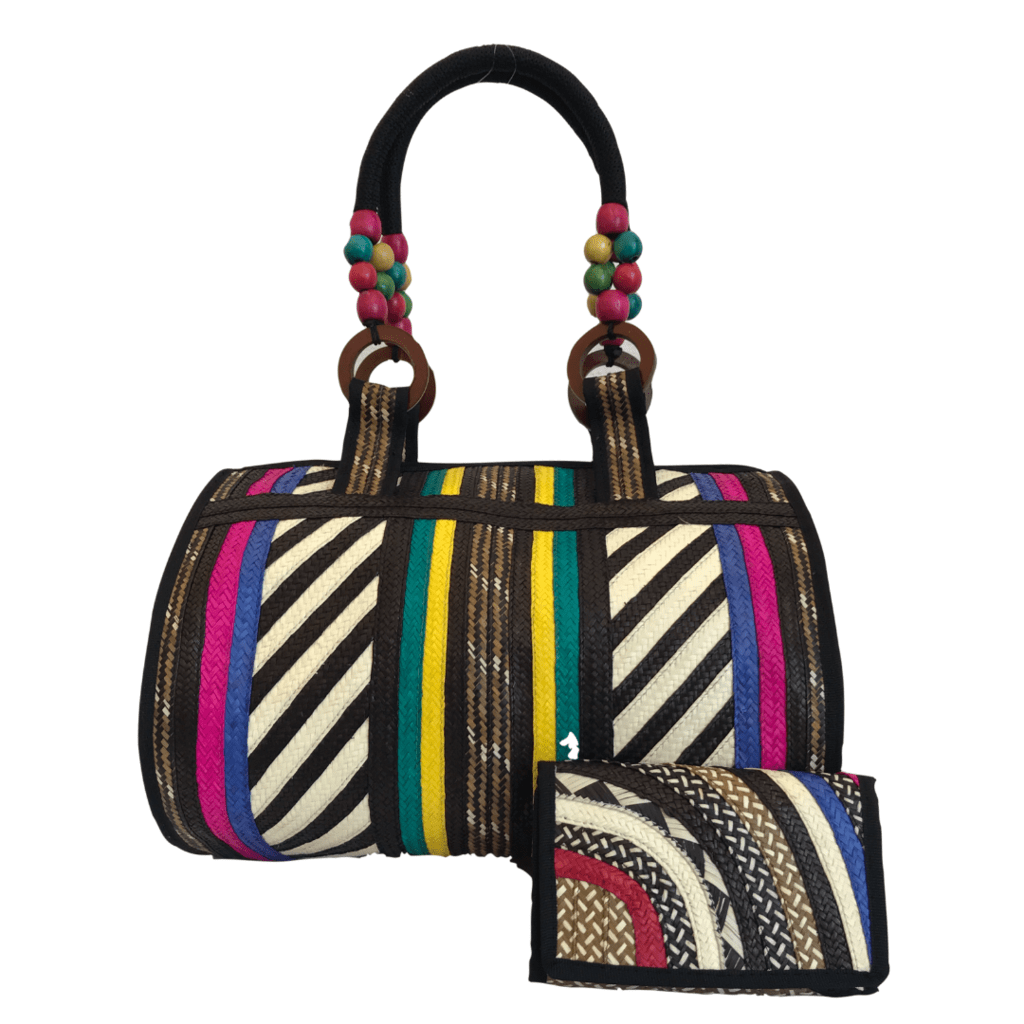 Set de bolso y billetera en caña flecha mediano, color en fibra natural y multicolor, cierre de corredera , forro y bolsillo interno. Elaborado por los artesanos indígenas de la etnia Zenú (Tuchin – Córdoba).